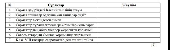 3. Сарматтар — б.з.б 8 ғ.- б.з. 8 ғ. Қазақстанның батыс өлкелерін, оңтүстік Орал алқаптарын мекендеген, үлкен тобы Еділден батысқа қарай өтіп, солтүстік Қара теңіз өңірлерін жайлаған тайпалардың шартты атауы. “