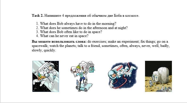 Второе задание - Ответьте на вопросы, Напишите 4 предложения об обычном дне Боба (Bob) в космосе.