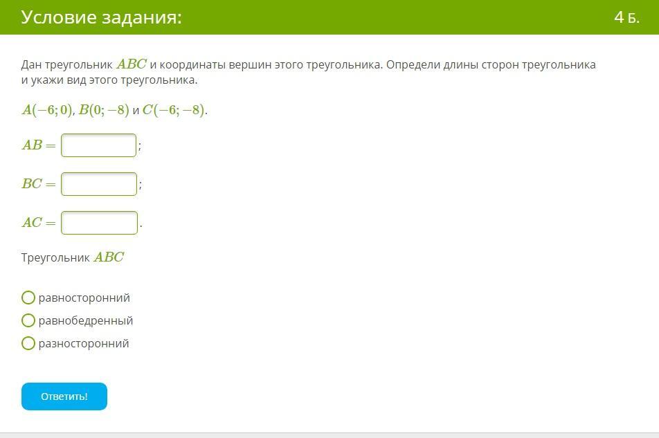 Дан треугольник ABC и координаты вершин этого треугольника. Определи длины сторон треугольника и укажи вид этого треугольника.