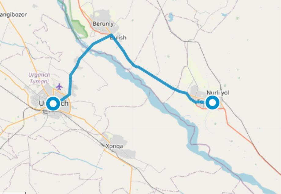 Как видно из карты, которая дана ниже в приложении, эти города расположены на разных берегах реки Амударьи и соединяются дорогой, проходящей через реку.