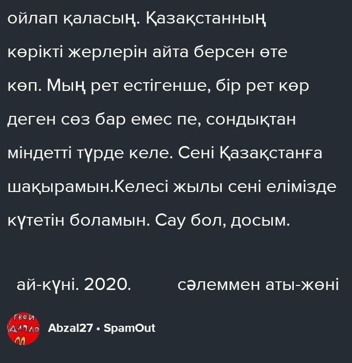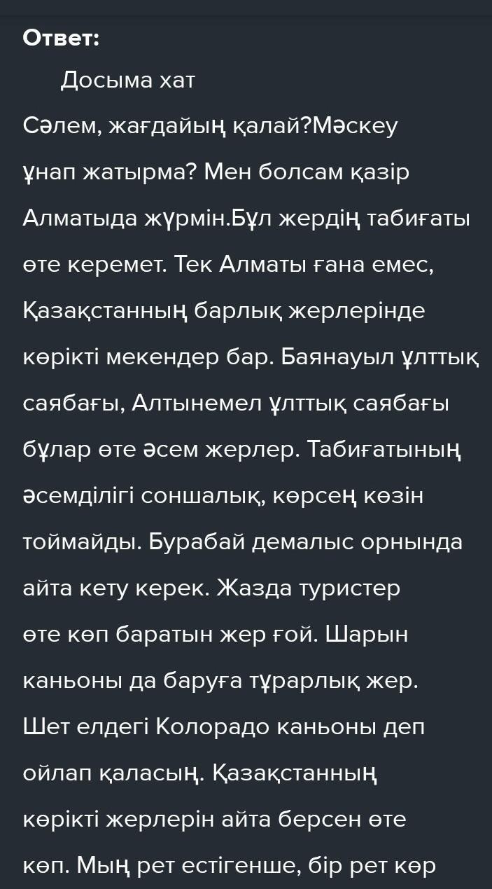 Басқа елде тұратын досыңызға өзіңіз тұратын жерінді сипаттап, хат жазыңыз. Хат мазмұнында хабарлы, сұраулы, лепті сөйлемдерді қолданып, хат стилін сақтаңыз Болымды және болымсыз етістіктерді қолдана отырып, еліміздің көрікті жерлері туралы (70 -80 сөз) 5 кл строчно