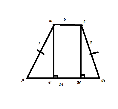 В равнобедренной трапеции основания равны 6 см и 14 см, а боковая сторона равна 5 см. найти площадь этой трапеции.