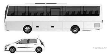 На рисунке изображены автобус и автомобиль. Длина автомобиля равна 4,2 м. Какова примерная длина автобуса? Ответ дайте в целых метрах.