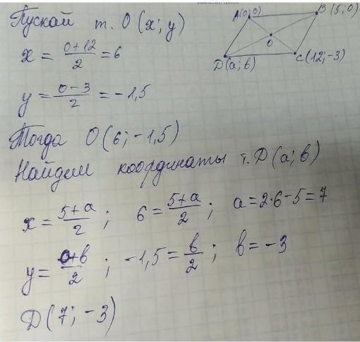 ⦁ Найдите абсциссу точки D параллелограмма ABCD, если А(0.0)В(5.0)С(12.-3) , а Р точка пересечения диагоналей параллелограмма [3] ПОМОГИТЕ