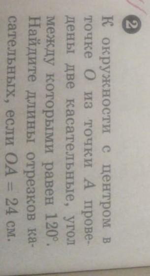 к окружности с центром в точке о из точки а проведены две касательные угол между которыми равен 120 градусов найдите длины отрезков касательных если оа=24см. Помогите и нарисовать ресунок и написать обяснение решению