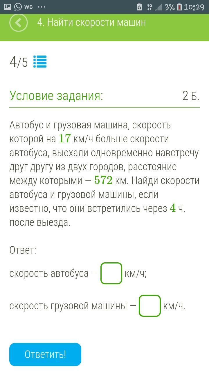 Автобус проехал х*4 км до места встречи, а грузовой автомобиль (х+17)*4 км, вместе это весь путь 572км