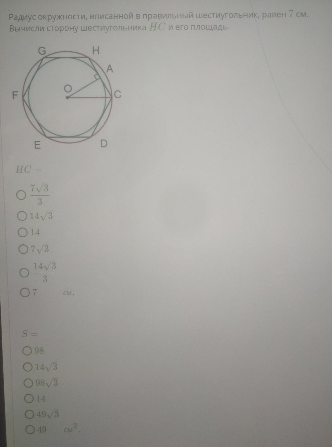 Радиус окружности, вписанный в правильный шестиугольник, равен 7 см. Вычислите сторону шестиугольника HC и его площадь.