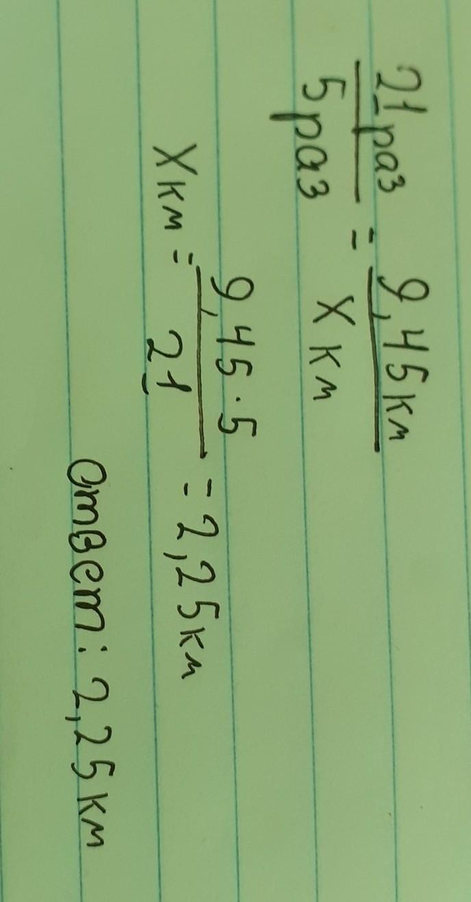 ПОМОГИТЕ СРОЧНО НАДО!!!Спортсмен, пробежав по кругу стадиона 21 раз(-а), преодолевает 9,45 км. Определи, сколько километров преодолеет спортсмен, если пробежит 5 кругов.
