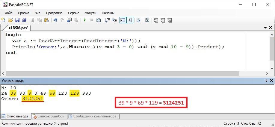 - Println('Ответ:',a.Where(x->(x mod 3 = 0) and (x mod 10 = 9)).Product);