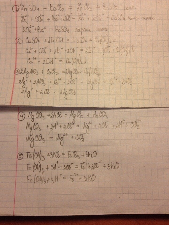 Даны растворы: ZnSO4 и BaCl2; СuSO4 и LiOH; AgNO3 и CaCl2; MgCO3 и HCl; Fe(OH)3 и HCl; В каких случаях растворы идут до конца?! Записать в полном и сокращённом ионном виде.