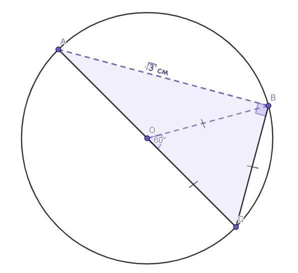 На круге размещены токчи А, В и С так, что АС - диаметр круга, а хорду ВС видно с центра окружности круга под углом в 60°. Найдите радиус круга, если АВ = см.