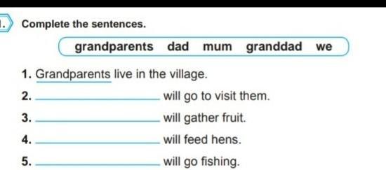 Ответ:2) We will to visit them. 3) Mum will gather fruit. 4) Grandad will feed hens. 5) Dad will go fishing.