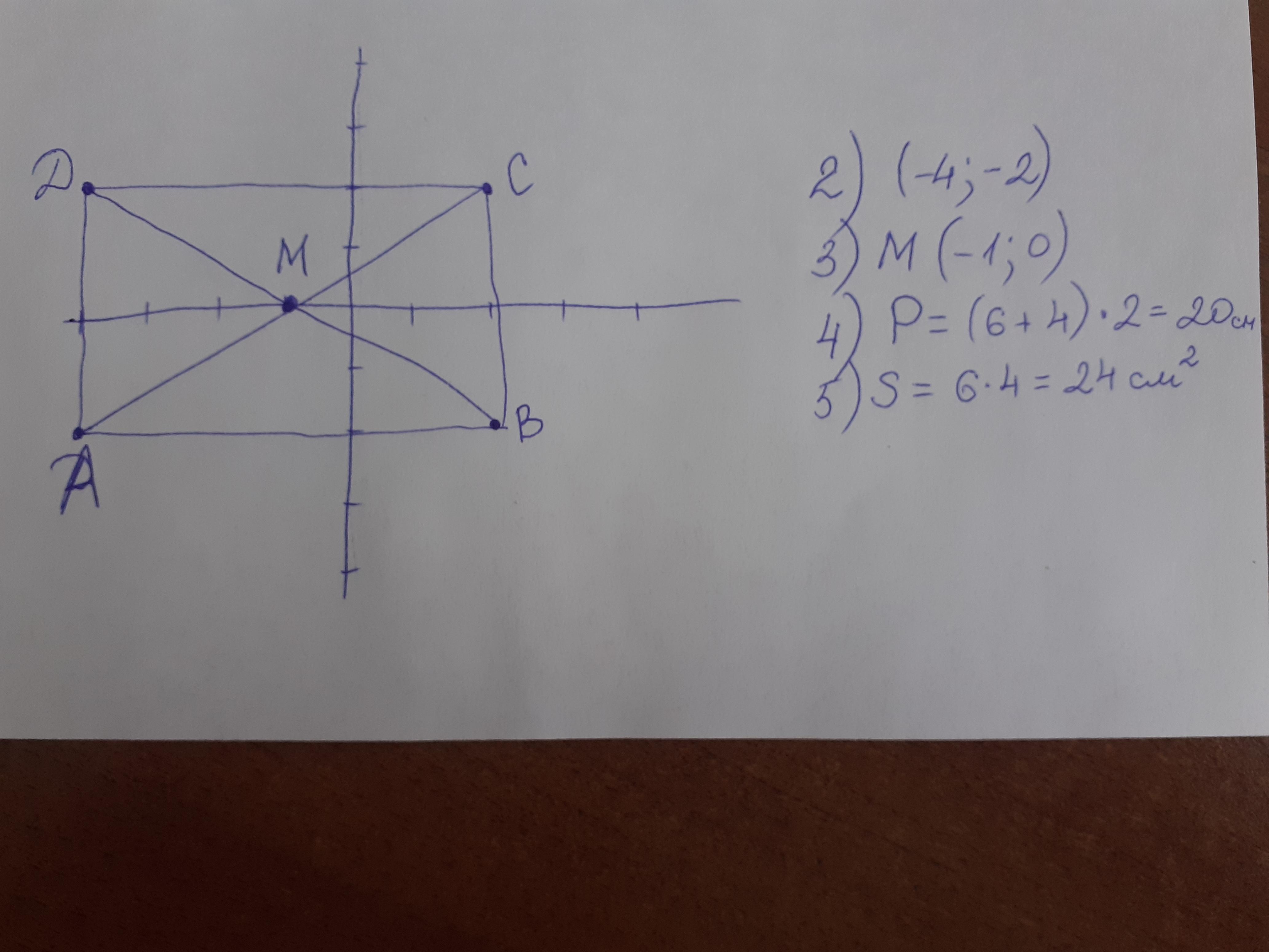 Даны координаты трех вершин прямоугольника АВСD: В(2; -2), С(2; 2) и D(-4; 2). 1) начертите этот прямоугольник (за единичный отрезок нужно взять 1см); 2) найдите координаты точки А; 3) найдите координаты точки пересечения диагоналей АС и ВD-точки М; 4) найдите периметр и площадь прямоугольника АВСD.