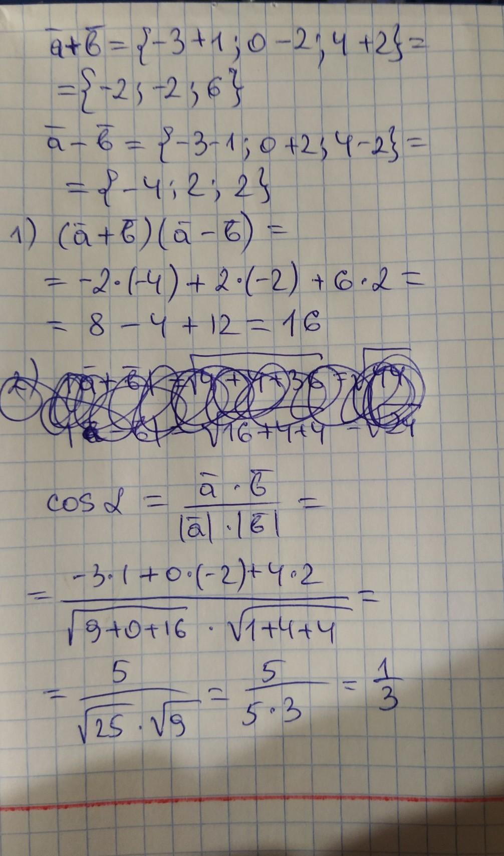 Даны векторы а(-3;0;4) и b(1;-2;2). а) найдите скалярное произведение векторов (а+ b)(a-b). б) найдите косинус угла между векторами а и b.
