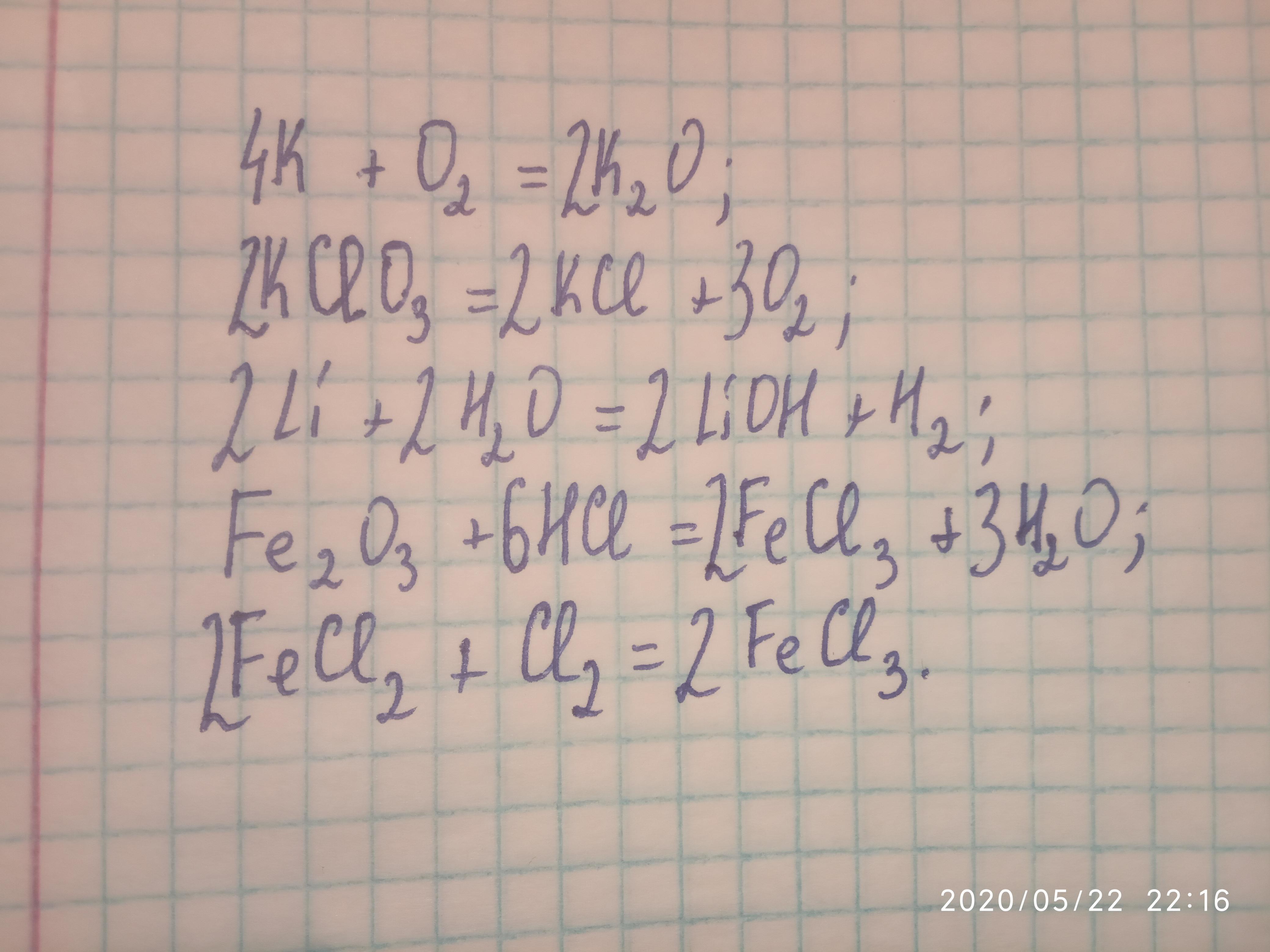Розставте коефіцієнти в схемах:K+O2=K2O;KClO3=KCl+O2;Li+H2O=LiOH+H2;Fe2O3+HCl=FeCl3+H2O;FeCl2+Cl2=FeCl3