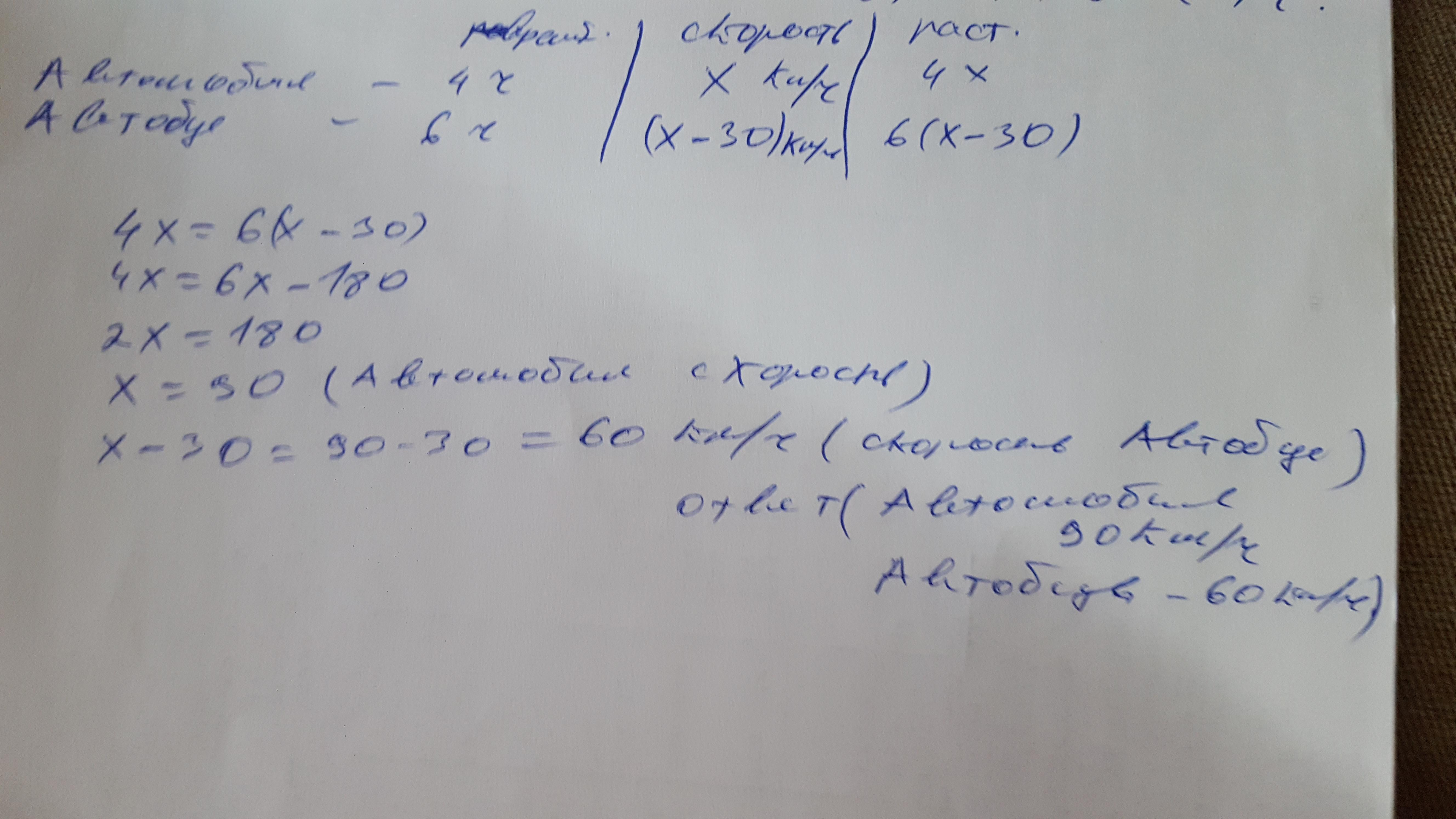 Автомобиль преодолевает расстояние между городом А и городом B за 4 часа, а автобус за 6 часов. Найдите скорости автомобиля и автобуса, если скорость автобуса на 30км/ч меньше скорости автомобиля.Срочно!!!! Даю много баллов!!!