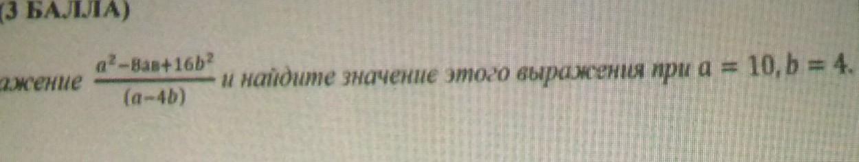 упростите выражение ( на картинке) и найдите значение выражения при а = 10, b = 4.