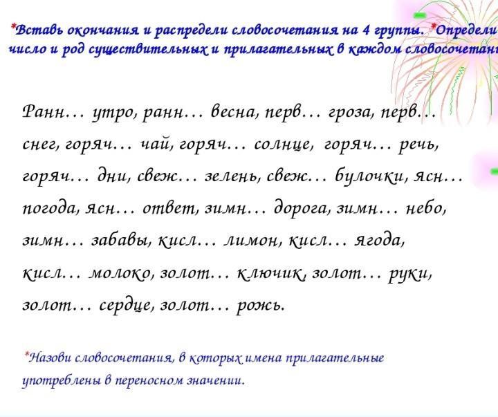 1) Раннее утро ед.ч. ср.р., горячее солнце ед.ч. ср.р.,зимнее небо ед.ч. ср.р.,кислое молоко ед.ч. ср.р., золотое сердце ед.ч. ср.р.