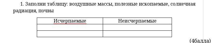 Заполни таблицу: воздушные массы, полезные ископаемые, солнечная радиация, почвы