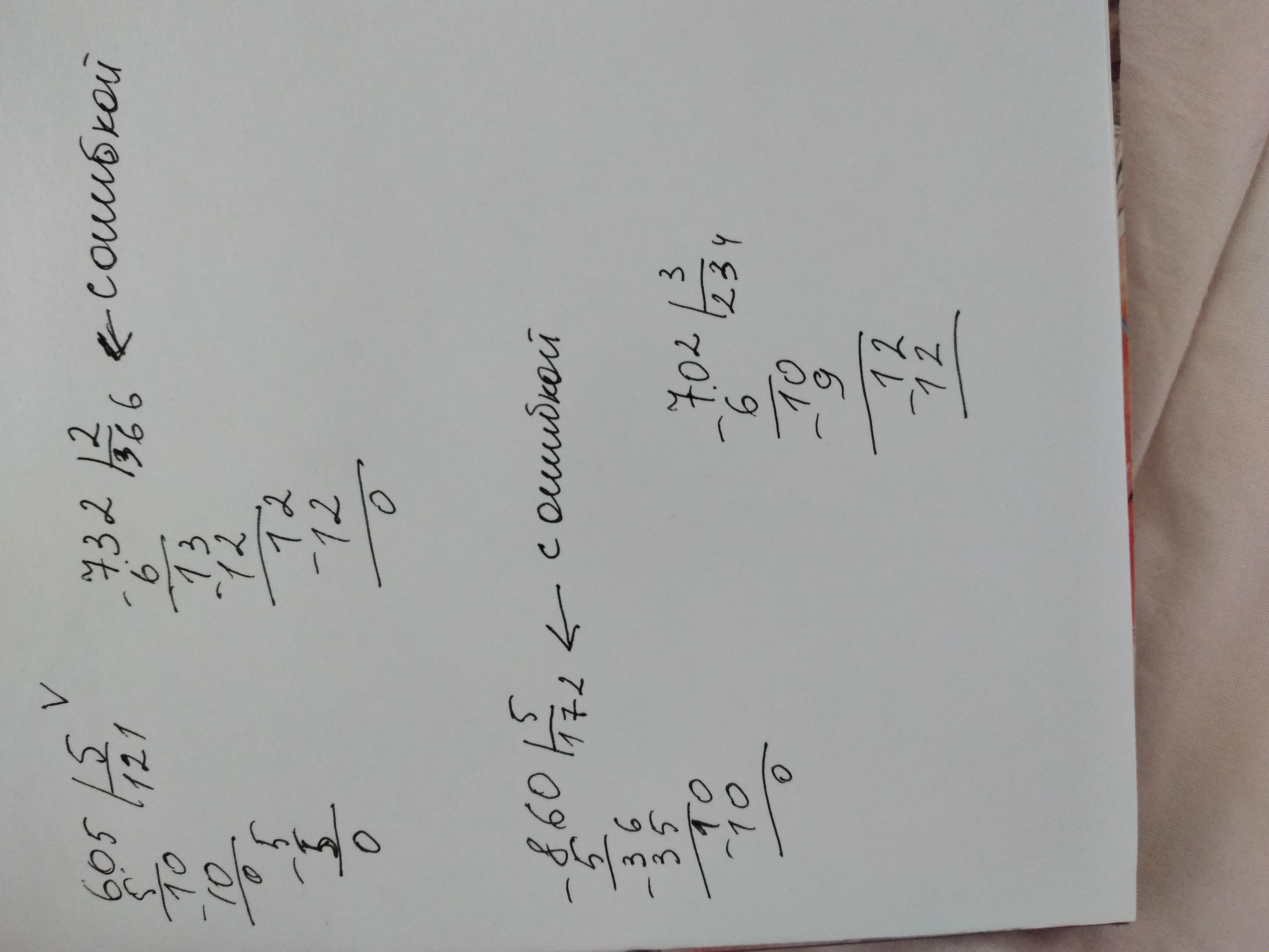 выполни деление в столбик отметь примеры в которыч допущена ошибка 605:5=121 732:2 = 376 860 :5=170 702:3=234