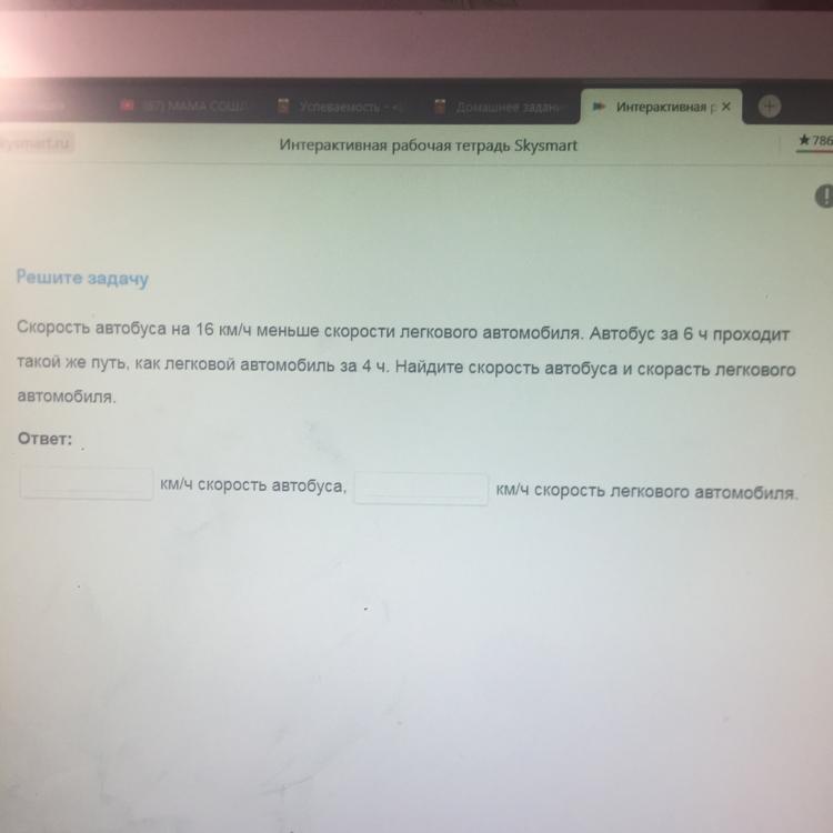 Скорость автобуса на 16 км/ч меньше скорости легкового автомобиля. Автобус за 6 ч проходит
