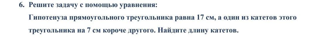 Пусть катет a=x, тогда катет b=x+7. Зная, что a²+b²=c² и с=17,составим и решим уравнение: