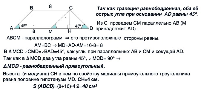 В равнобедренной трапеции основания равны 8 см и 16 см, а угол при основании равен 45 градусов.Чему равна площадь трапеции?