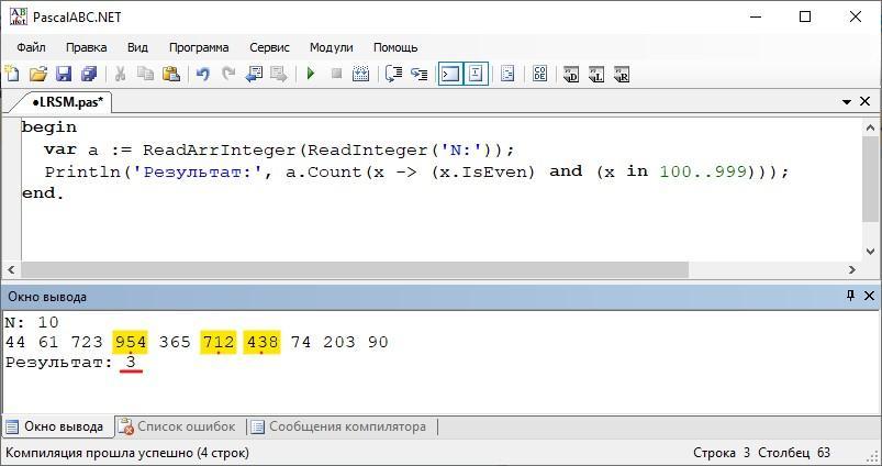 - Println('Результат:', a.Count(x -> (x.IsEven) and (x in 100..999)));