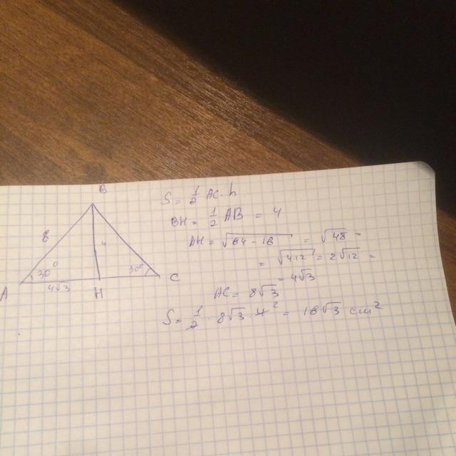 боковая сторона равнобедренного треугольника 8 см. Угол при основании равен 30 градусам. Найдите основание треугольника