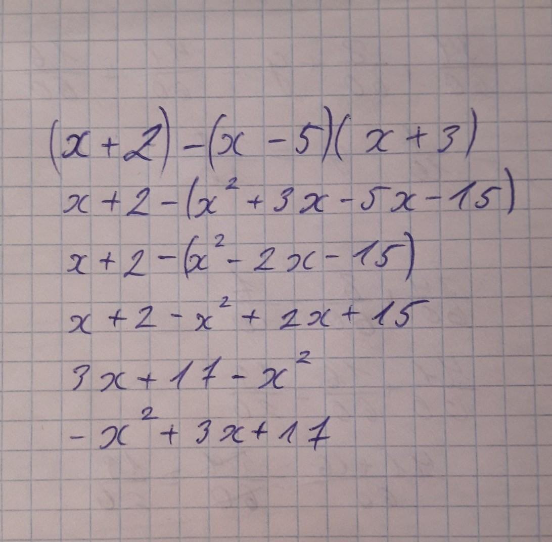 (х+2)-(х-5)(х+3) = x + 2 - x² + 2x + 15 = -x² + 3x + 17