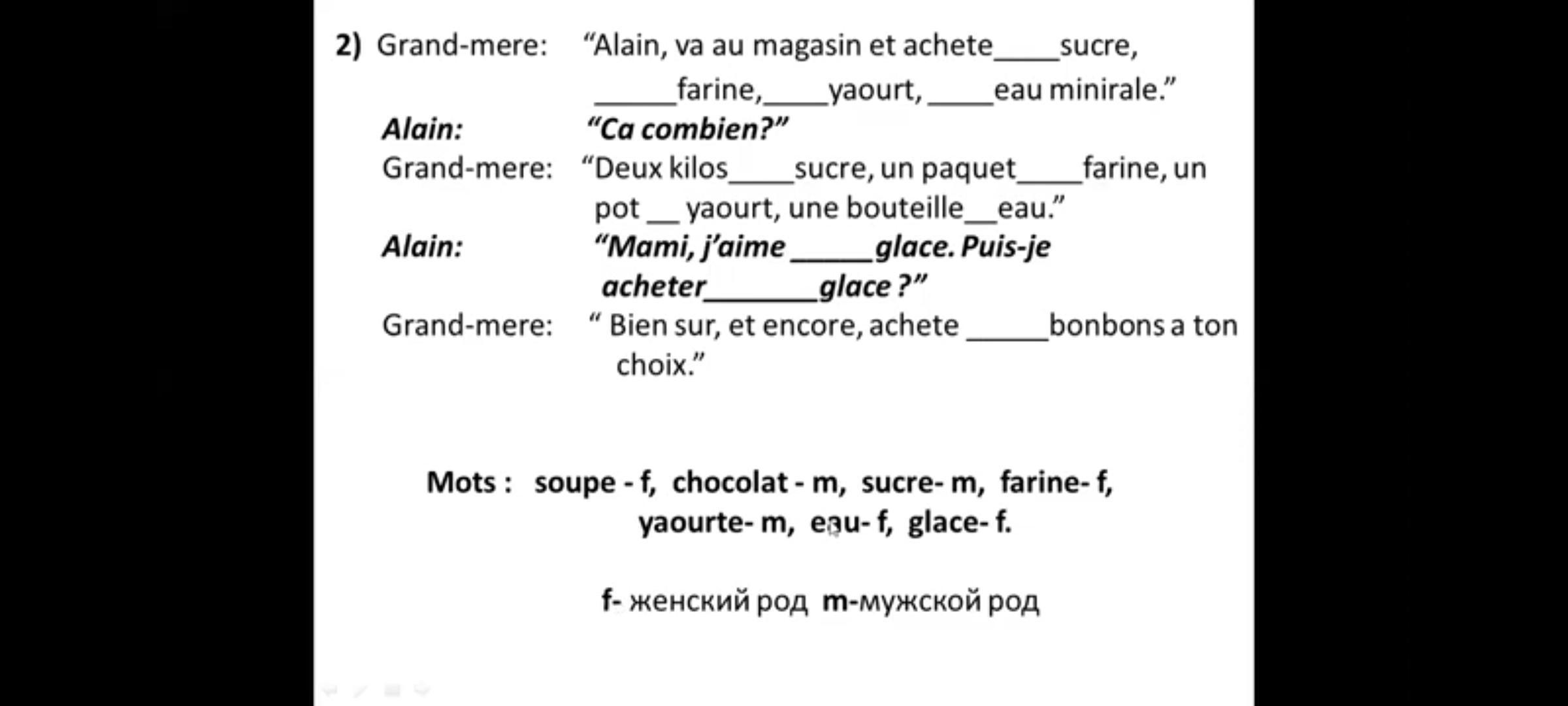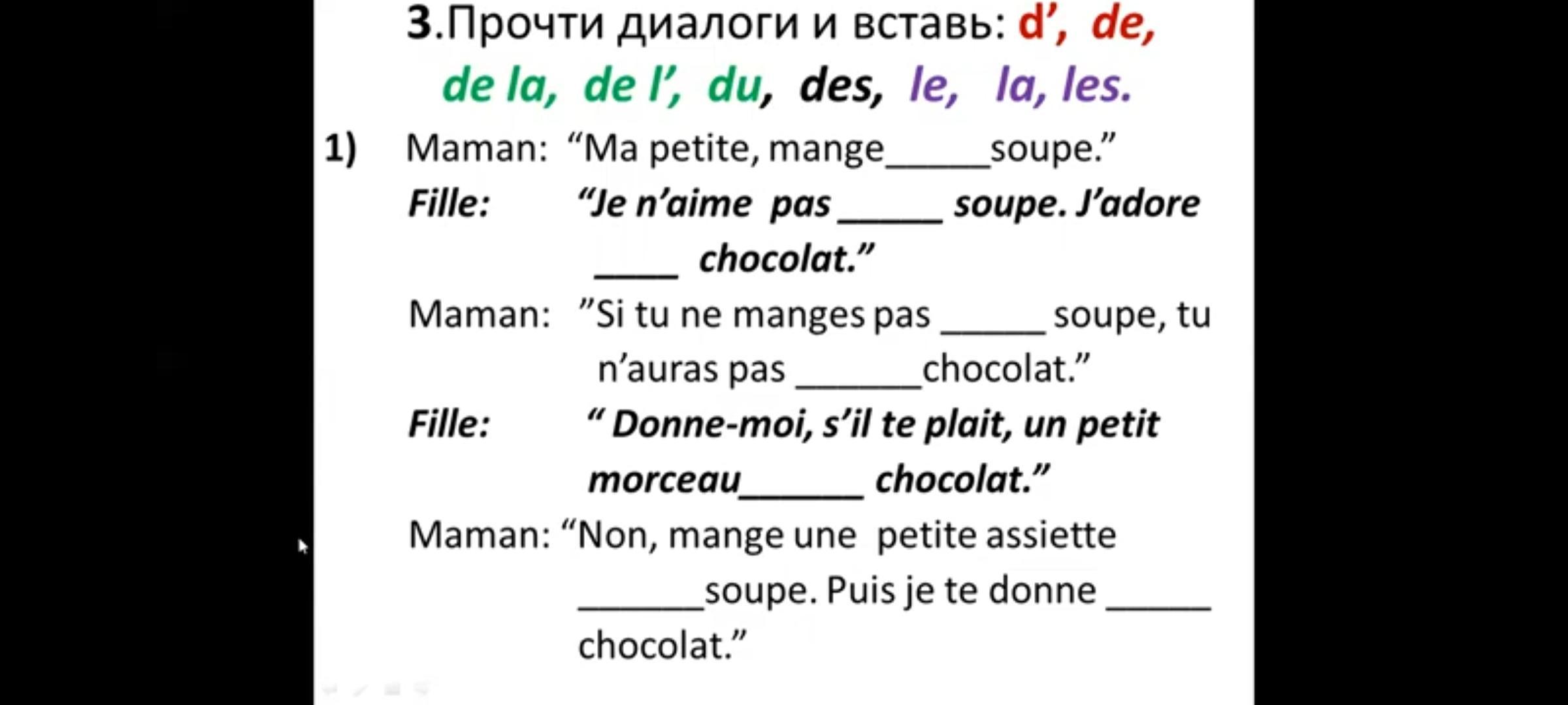 2) du, de la, de l'. de l' ,de, de, de, d', la, de la, des.