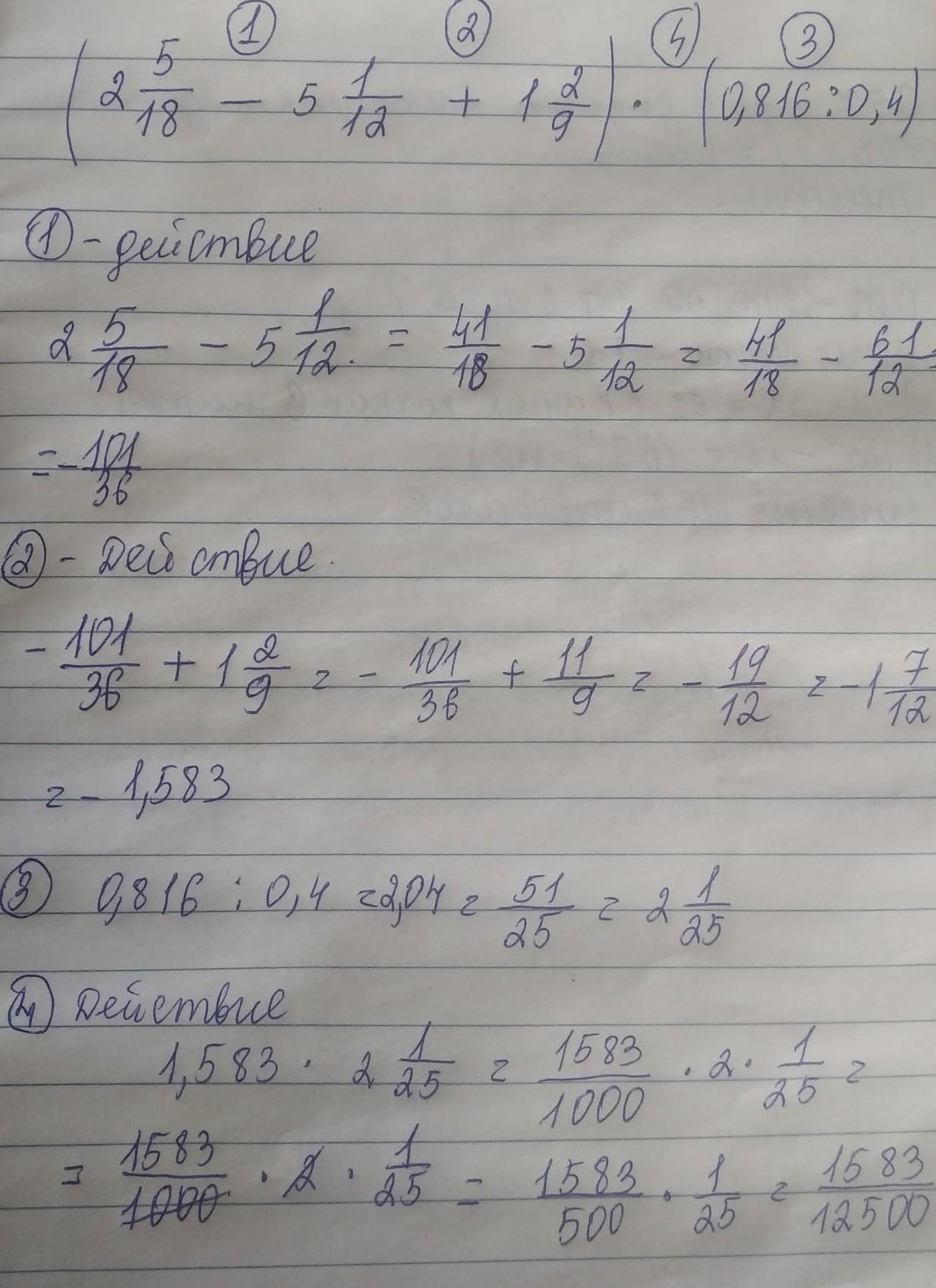1 -первое действие в скобках , тоесть выполняем вычитание , а затем сложение дробей, дальше уже выполняем 3 по лету действие тоже в скобках (деление), а зате 4, тоесть перемножаем то, что получилось в обоих скобках, это и будет ответ