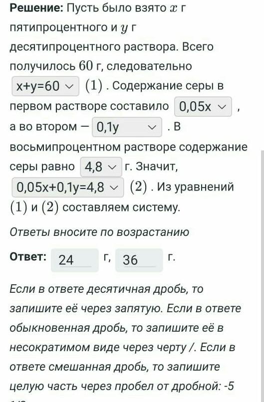 Чтобы получить 60 граммов восьмипроцентного раствора серной кислоты, смешали серную кислоту пятипроцентого и десятипроцентого растворов. Сколько было взято кислоты каждого раствора? !!!! !