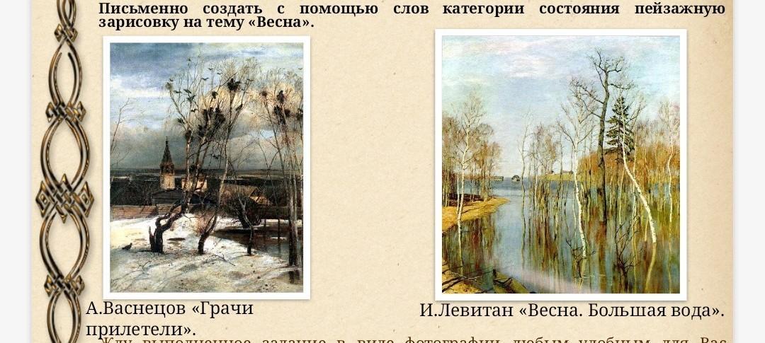 Письменно создать с помощью слов категории состояния пейзажную зарисовку на тему «Весна».