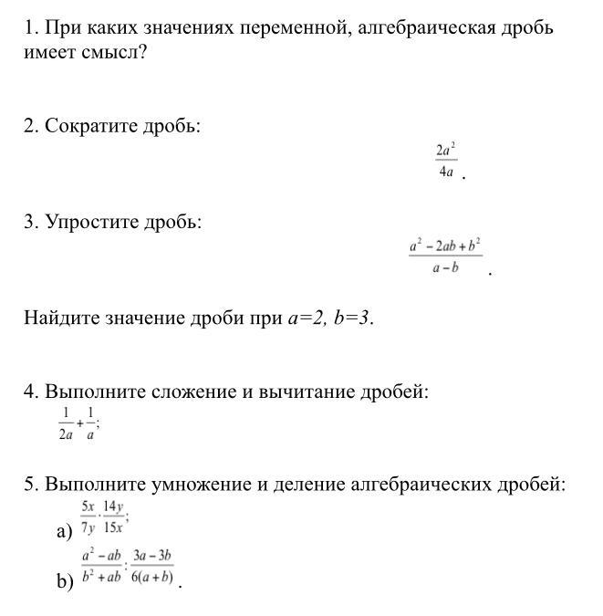 1) Алгебраическая дробь имеет смысл, если знаменатель дроби не равен нулю.