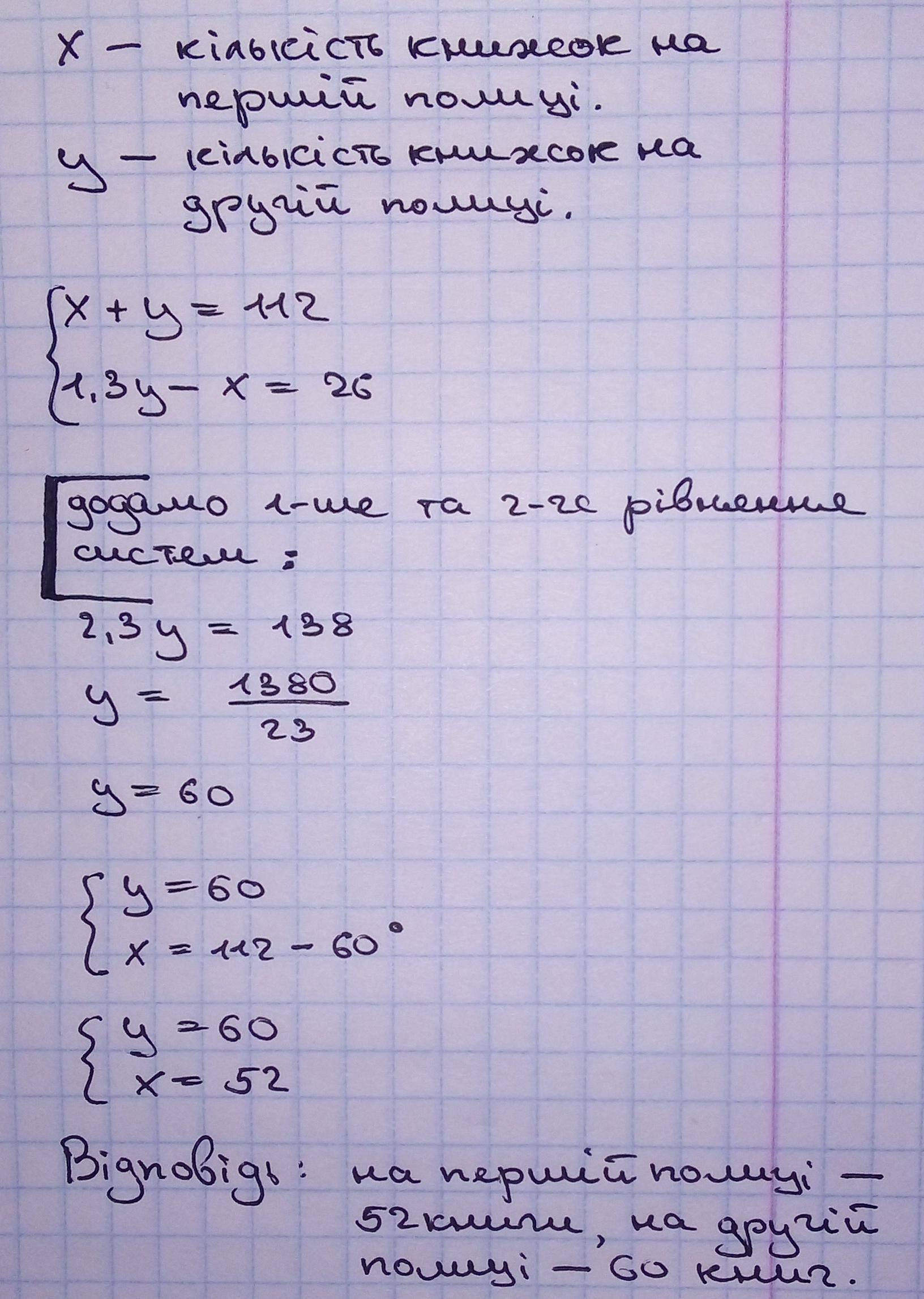 Потрібно скласти лінійне рівняння!!! На двох полицях 112 книжок. Якщо на другу полицю поставити 30% від кількості, що вже стояла, то на ній стане на 26 більше, ніж на першій полиці. Скільки книжок було на кожній полиці спочатку?