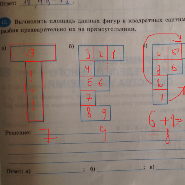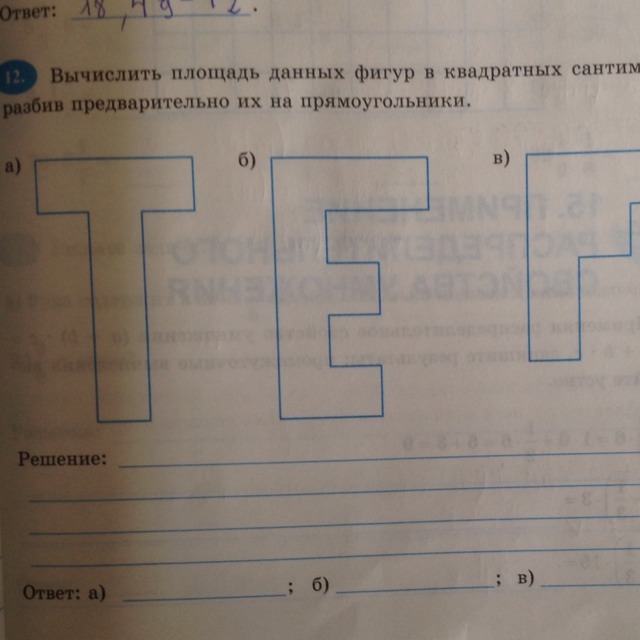 Помогите очень надо))) Вычислите площадь данных фигур в квадратных сантиметрах, разбив предварительно их на прямоугольники. В интернете нет, я искала(( фигуры на картинках