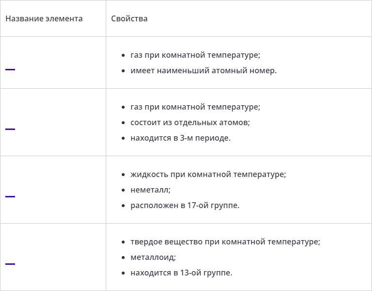 Определите элементы по их свойствам. На место пропуска впишите название элемента (например, кислород).
