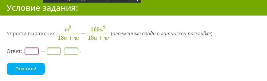 2. Используем формулу сокращённого умножения (в данном случае разность квадратов): (w-13a)(w+13a)/13a+w