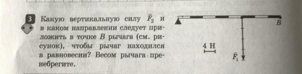 Какую вертикальную силу и в каком направлении нужно приложить в точке В рычага, изображённого на рисунке, чтобы он находился в равновесии? Весом рычага пренебречь.