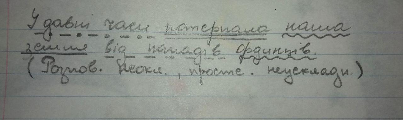 Зробити синтаксичний розбір речення. (підкреслити члени речення та написати характеристику) У давні часи потерпала наша земля від нападів ординців.