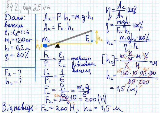 Відношення короткого плеча важеля до довгого дорівнює 1:6. ККД важеля 80%.