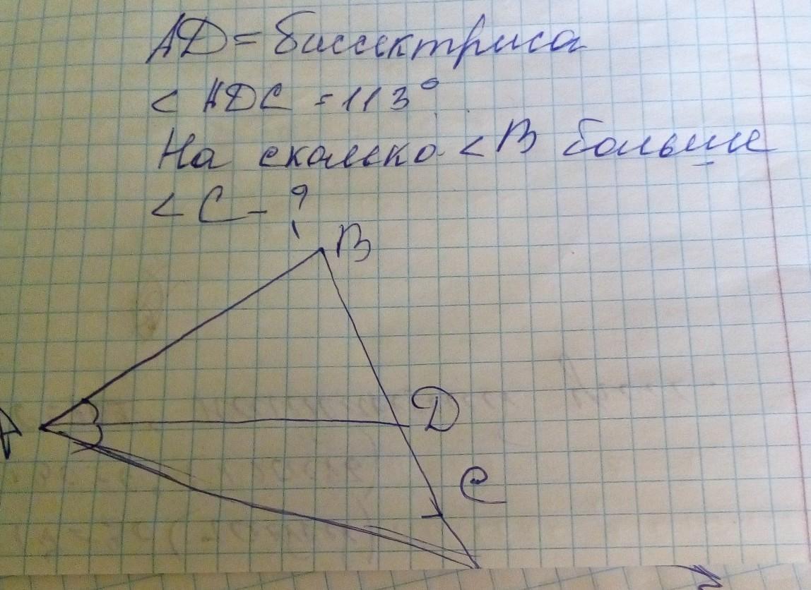 Объяснение:пусть ∠ВАД=∠САД=Х°,Т.К ∠АДС=113°,то ∠АДВ=180-113=67°;