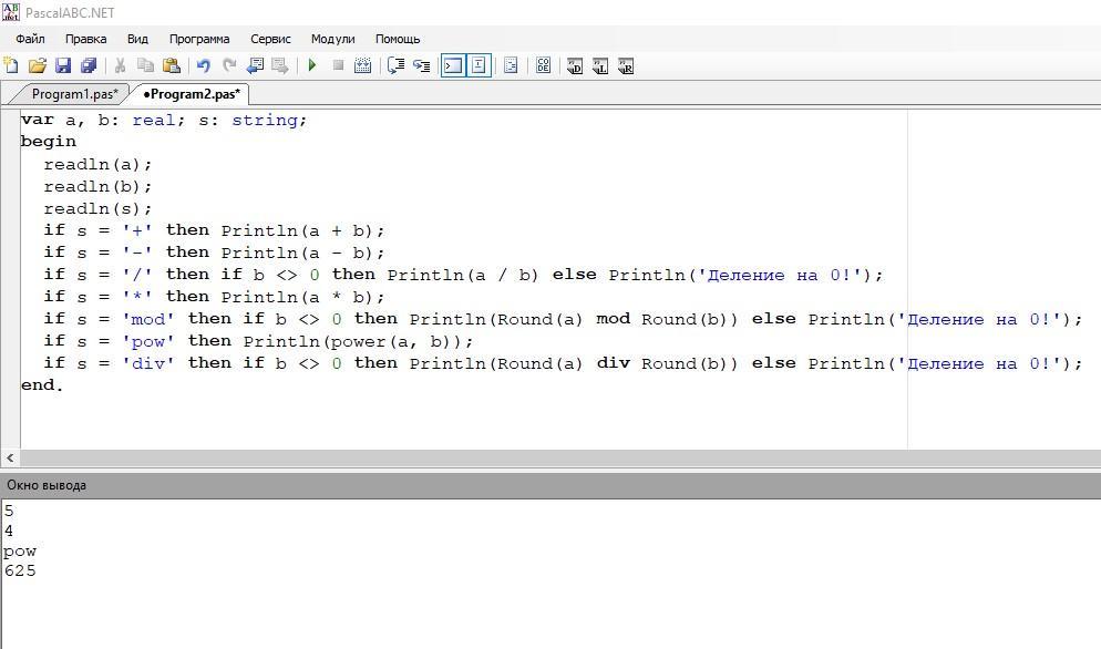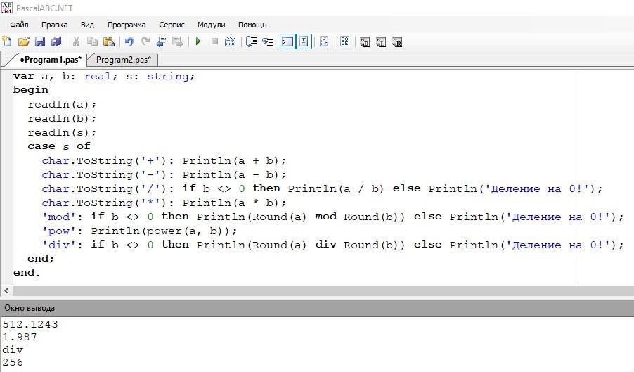 - 'mod': if b <> 0 then write(Round(a) mod Round(b)) else write('Деление на 0!');