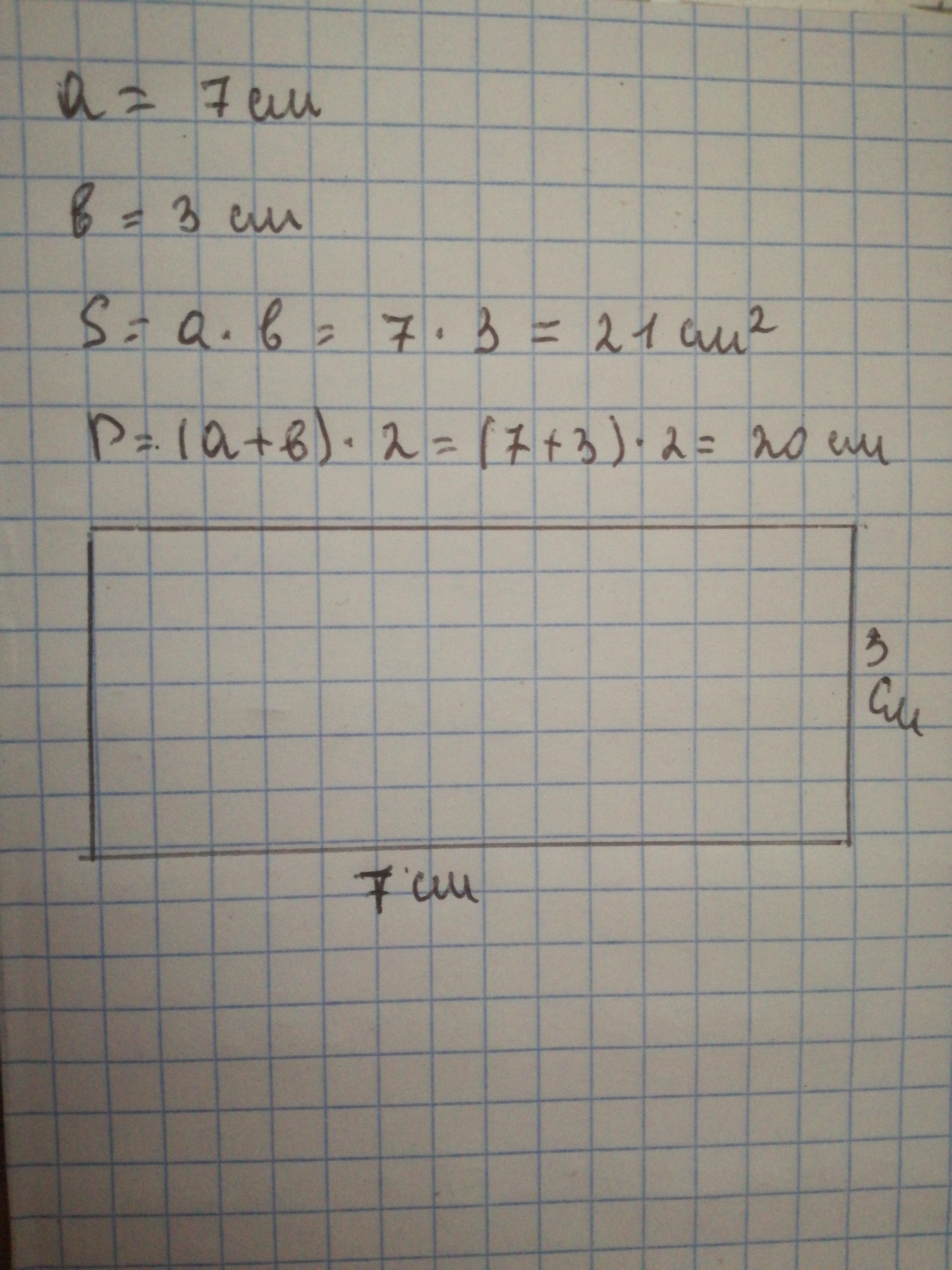 Длина прямоугольника равна 7 см, ширина 3 см. Найди площадь и периметр этого прямоугольника. Начерти прямоугольник