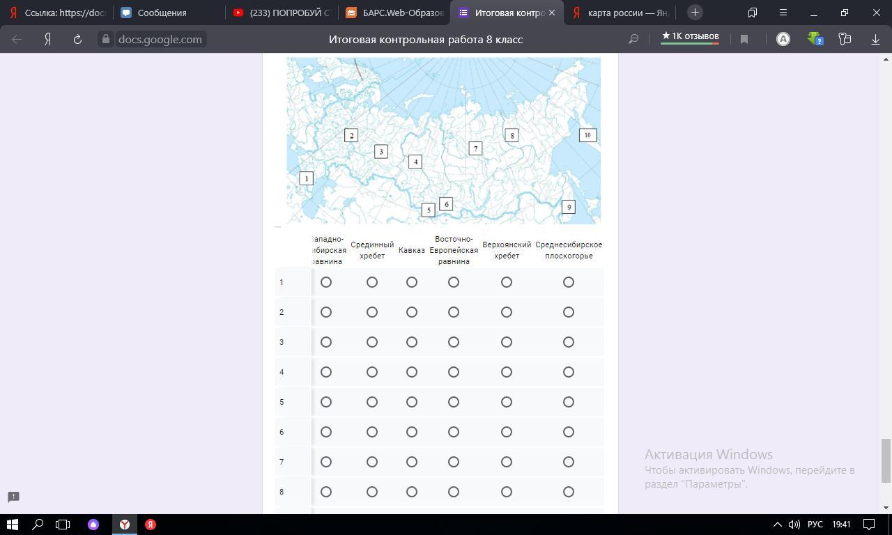 На карте цифрами обозначены крупные формы рельефа России. Соотнесите номера на карте и названия форм рельефа.