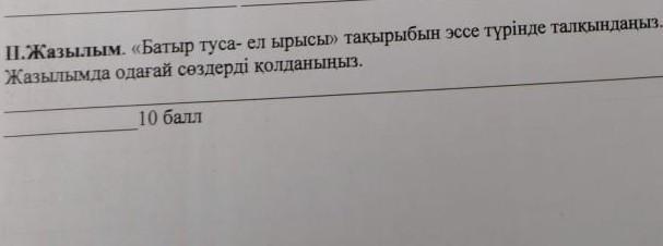 Отан өз батырларымен бай. Отанның қорғаушыларсыз, мемлекет жоқ. Бытылдық, Отан сүйгіштік, достық - нағыз батырдың сапалары. Батырлар болып дүниеге келмейді, олар болып қалыптасады. Балалық шақтан кішкентай балаға отаншылдыққа, құрметке тәрбиелеу керек. Атамекен үшін ата-аналарға нағыз жігітті тәрбиелеу керек ғой! Халықта дана мақал-мәтелдер бар: "Ер жігіт ел үшін туады, ел үшін өледі", "Ер барда - ел қор болмас" және тағы басқалар. Менің пікірінше, ең басты, ең негізгі батырдың сапасы - бұл отаншылдық. Отаншылдық - бұл туған жерге, өз халыққа, ұлтқа деген сүйіспеншілік.