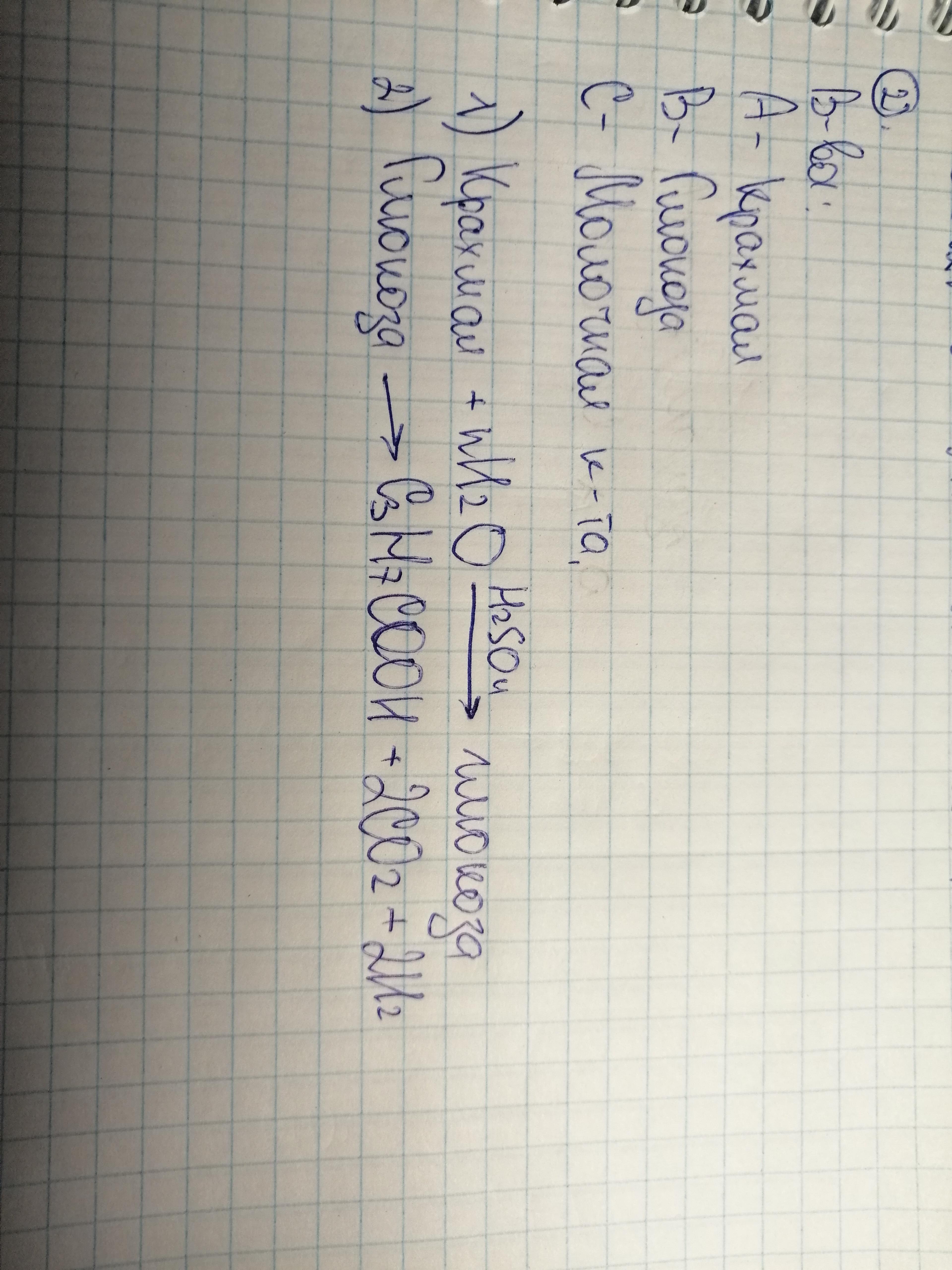 5. При добавлении горячей воды к твердому белому веществу А образуется клейстер. Продуктом гидролиза вещества А является вещество В, которое при действии ферментов, вырабатываемых бактериями отряда Lactobacillales превращается в вещество С.