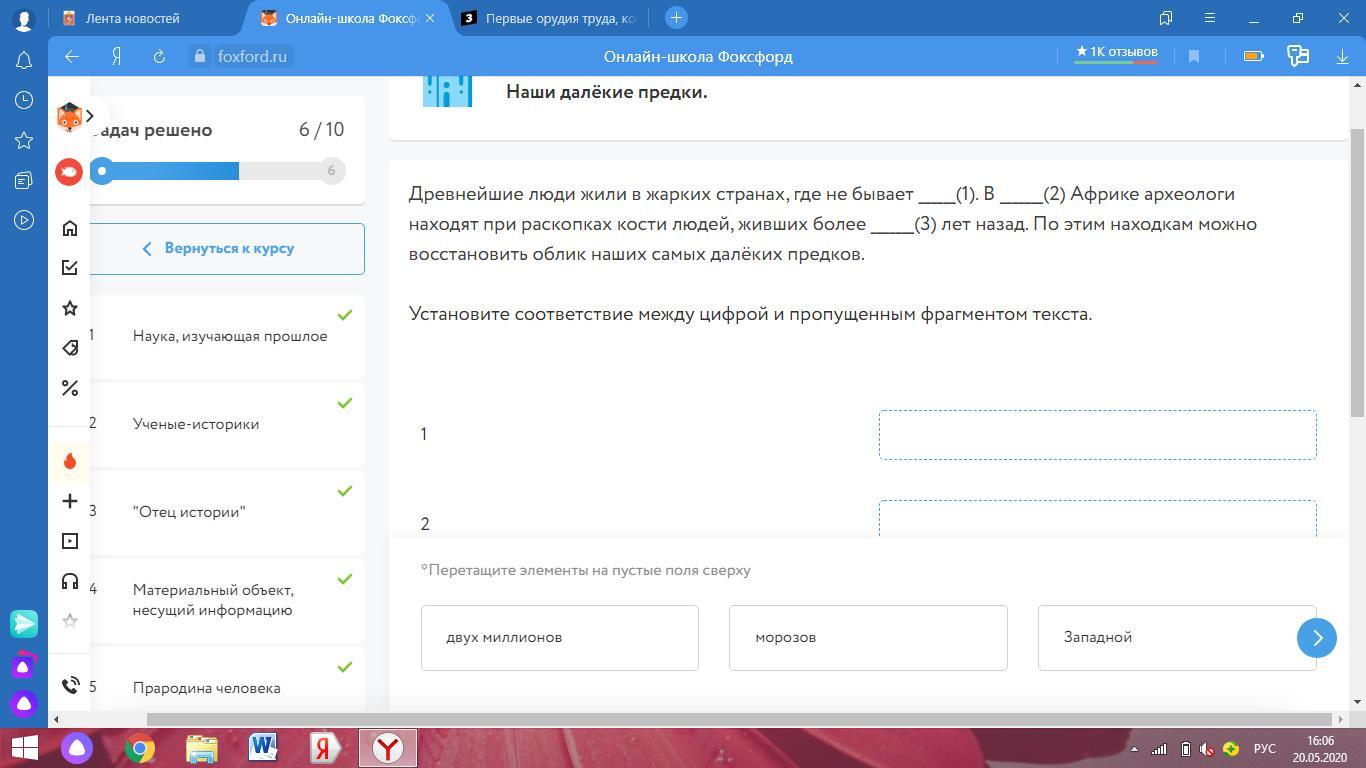 Древнейшие люди жили в жарких странах, где не бывает ______(1). В _______(2) Африке археологи находят при раскопках кости людей, живших более _______(3) лет назад. По этим находкам можно восстановить облик наших самых далёких предков.