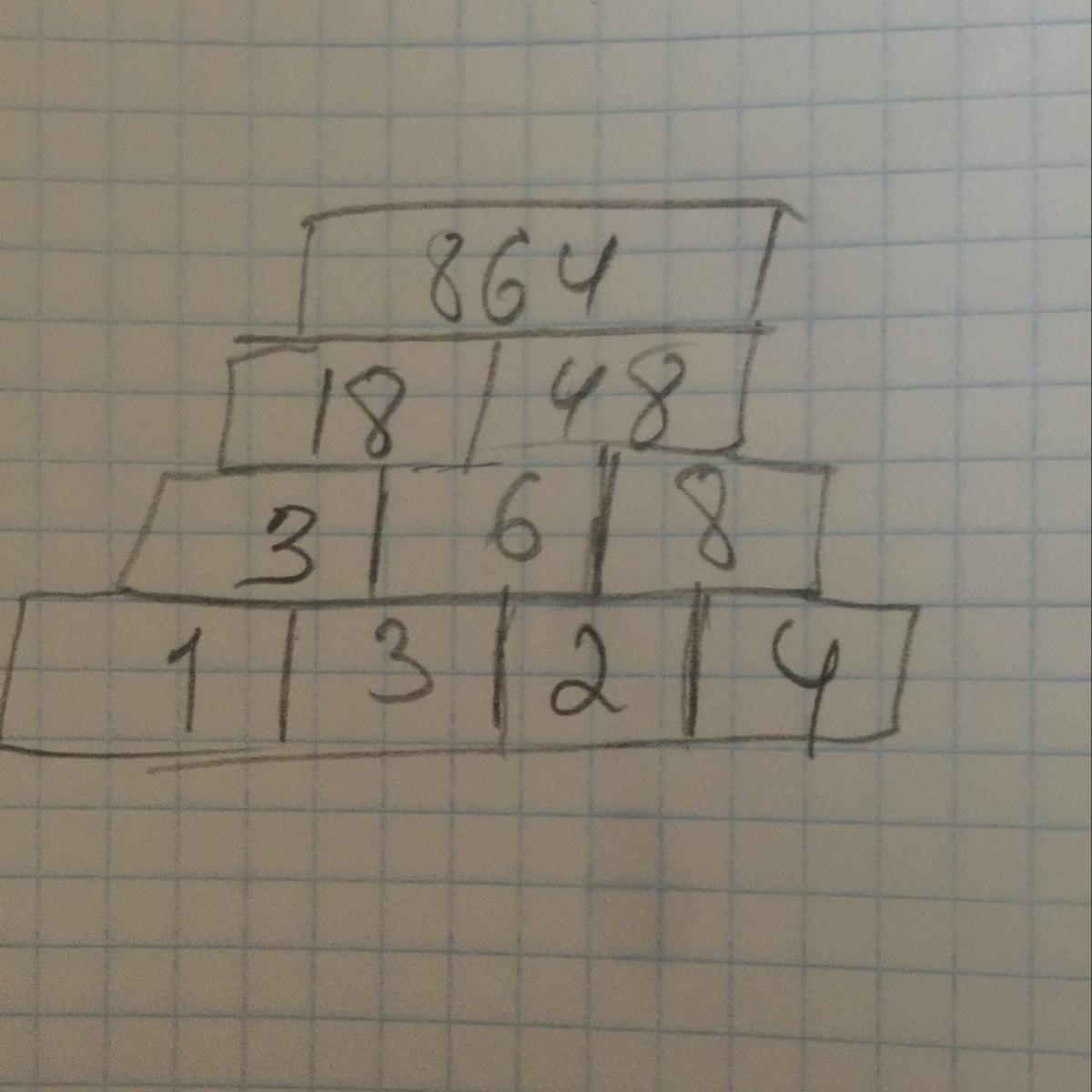 Верхнее число в числовой пирамиде составляет произведение двух чисел, находящихся ниже. Заполните клетки пирамиды.